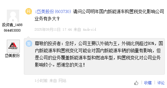 9月15日,岱美股份(603730)在互动平台上表示,公司主要以外销为主,外销比例超过80%,国内新能源车购置税变化可能会对国内新能源车辆的销量有影响按天配资公司,但是公司的业务覆盖新能源车型和燃油车型,购置税变化对公司业务影响较小。